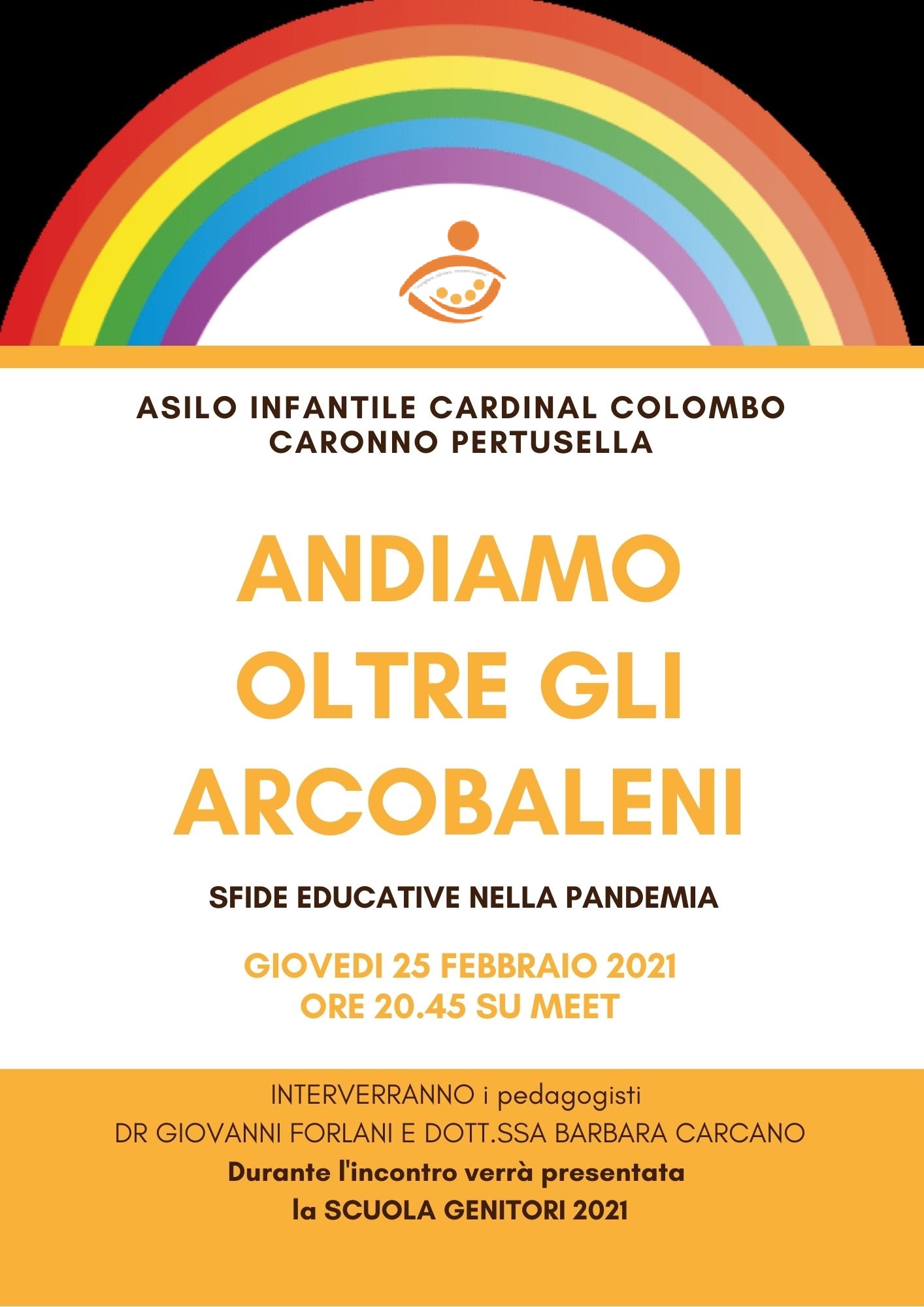 17 Febbraio 2021 By secras Avvisi / Generale / News 0 Comments Il 25 febbraio 2021 con i nostri pedagogisti Dott.ssa Carcano e Dr. Forlani riprende la Scuola genitori: ANDIAMO OLTRE GLI ARCOBALENI