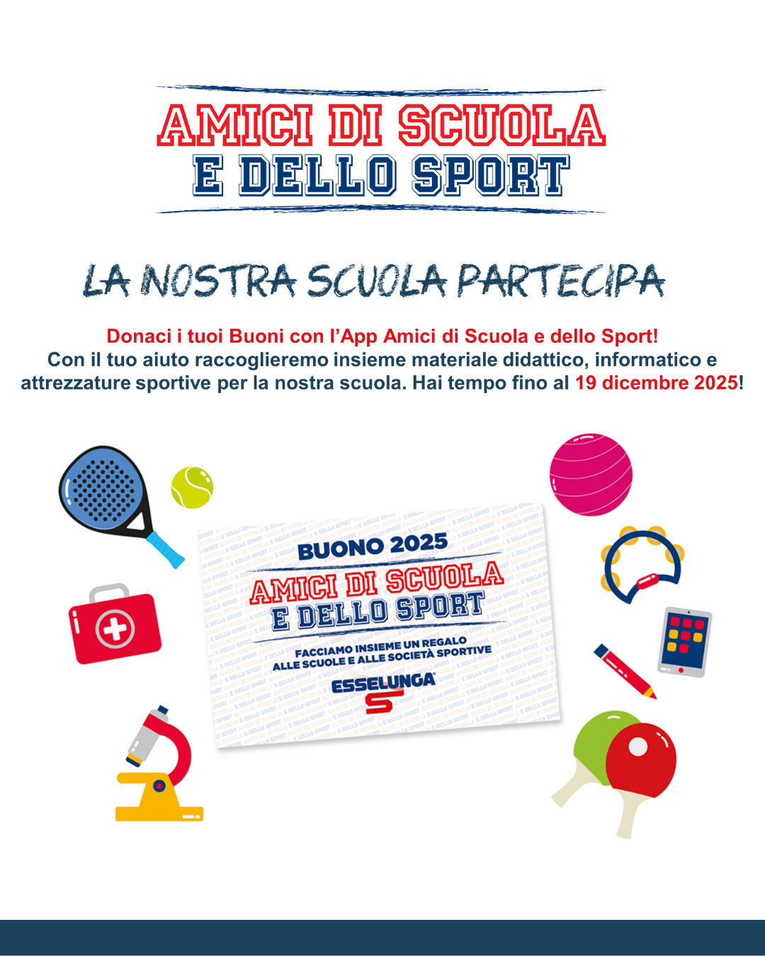 È per questo che il Catalogo viene rinnovato ogni anno con nuovi articoli funzionali alla didattica, ma anche con tanti prodotti volti a favorire una pratica sportiva più inclusiva. Con queste ambizioni e obiettivi, Amici di Scuola e dello Sport nel 2025 spegnerà 11 candeline: a partire dall’8 settembre fino al 16 novembre i Clienti riceveranno i Buoni Amici di Scuola e dello Sport in funzione della spesa effettuata, e potranno consegnarli fisicamente o tramite l’App alla scuola o società sportiva dilettantistica di preferenza. Con i Buoni raccolti, le Scuole e le Società Sportive potranno richiedere gratuitamente gli articoli desiderati, scegliendo tra quelli didattici e quelli funzionali alla pratica sportiva.