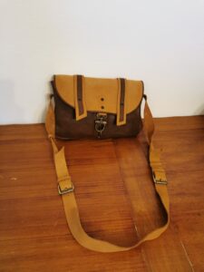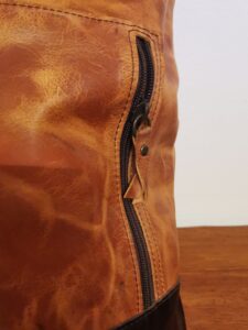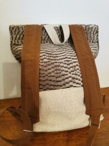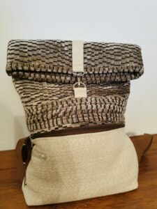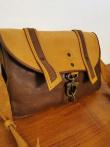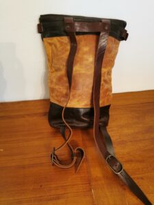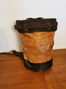 MANUFATTO 9: Zaino in pelle di Bovino bicolor foderato in stoffa con tasche interne anche per il computer. Chiusura vintage in stile “posta” . Tracolle regolabili.