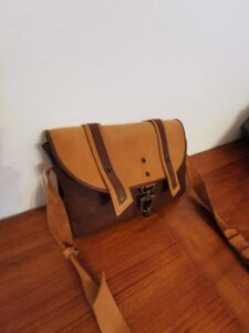 MANUFATTO 10: Borsa in pelle dii bovino bicolor con 2 tasche frontali ed una centrale, Chiusura con patella e moschetto, tracolle regolabili
