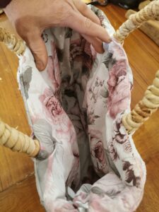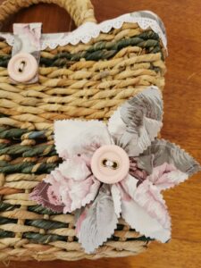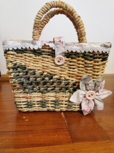 MANUFATTO 5: Borsa realizzata a mano intrecciando foglie di mais inumidite e tinte, fodera interna e decori fatti a mano in collaborazione con altro artigiano.