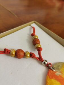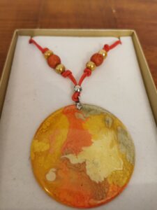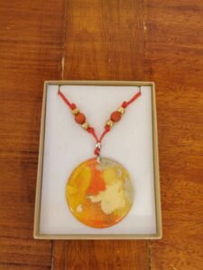 MANUFATTO 7: Ciondolo in madreperla dipinto a solvente, copertura in resina. Assemblato con cordino cerato, sfere in ceramica greca. Chiuso il tutto con moschettone in acciaio.