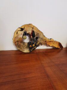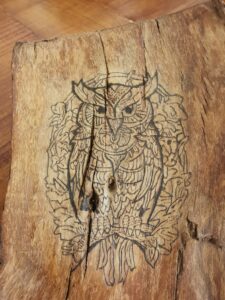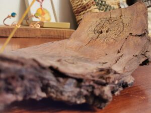 MANUFATTO 3: Porta incenso in corteccia, civetta pirografata a mano