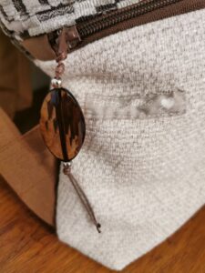 MANUFATTO 4: Borsa realizzata con vari tessuti, completamente fatta a mano, ciondolo decorativo sulla zip della tasca frontale, gancio metallico di chiusura, foderata internamente con pattern boschivo.